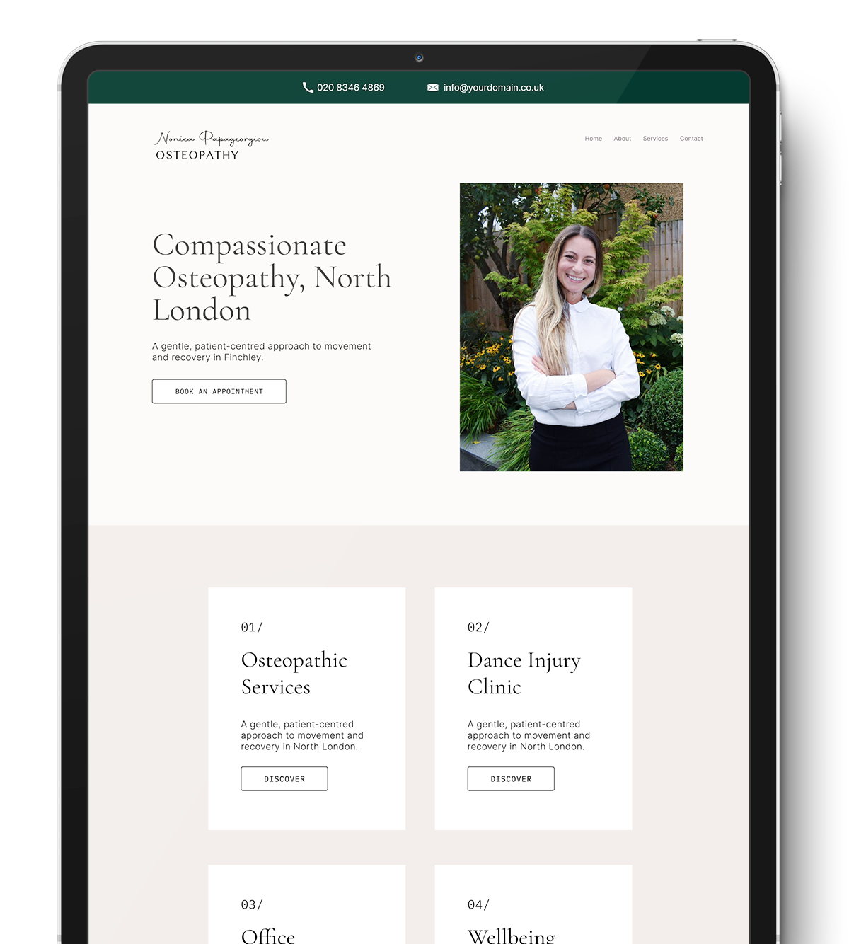 I designed a serene, patient-centered digital experience that emphasizes Nonica’s compassionate approach to recovery. The site clearly categorizes her specialized expertise—including a dedicated Dance Injury Clinic, Office Ergonomics, and general Wellbeing—to appeal to a broad North London demographic. To build immediate clinical authority, I integrated a prominent "Insurance We Accept" section and accreditation logos. The final design priorities accessibility with a clear "Book an Appointment" call-to-action and a localised contact section focused on her Finchley studio.